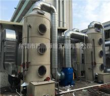 酸雾处理塔由循环水箱、喷淋层、填料层、除雾层、观检窗等组成。车间内酸雾废气由集气罩收集,经管道进入酸雾处理塔的填料层,填料层上有来自于顶部喷淋液体及前面的喷淋液体,并在填料上形成一层液膜,气体流经填料空隙时,与填料液膜接触并进行吸收或中和反应。酸雾塔内配置二层填料层和二层喷淋层,对于硝酸类处理难度较的酸雾,可适当增加喷淋层数,提高液气比,确保酸雾能保证达标排放。