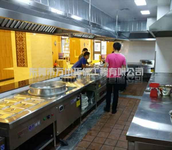 首先我们先来了解什么是厨房油烟净化。油烟净化主要是利用油烟净化器,把厨房排放出来的油烟气味处理到无油、无烟和无味,特别是餐饮行业经常要使用大火来进行烹饪,所以油烟净化器的另外一个作用是防火。这次常平分店的厨房是与大厅相连,开放式的。厨房设备长达20米,对抽风效果要求高,若抽风效果不好油烟就很容易进入大厅,影响到顾客的食用。